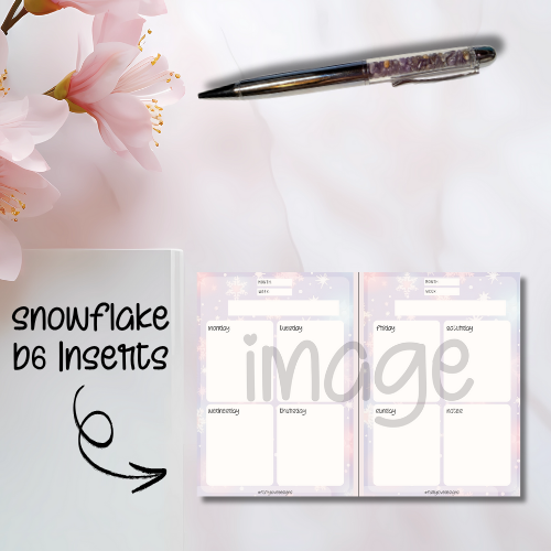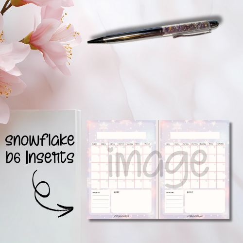 Transform your planner into a winter wonderland with these enchanting B6 disc inserts. Featuring delicate pastel snowflakes dancing across serene backgrounds, these versatile pages include monthly calendars, weekly spreads, notes sections, and customizable lists—everything you need to stay organized in style. Print only what you need, when you need it, giving you complete control over your planning setup. Perfect for adding a touch of seasonal magic to your daily routine while keeping your schedule beautifully on track.
