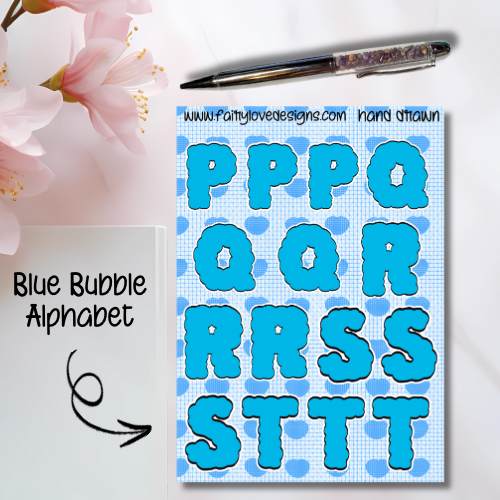 The Blue Bubble Alphabet consists of hand-drawn stickers designed to enhance journaling. Each sticker features a unique bubble-style letter, promoting creativity and personalization in journaling tasks. The whimsical design encourages engagement, making it easier for users to express ideas effectively and systematically.
