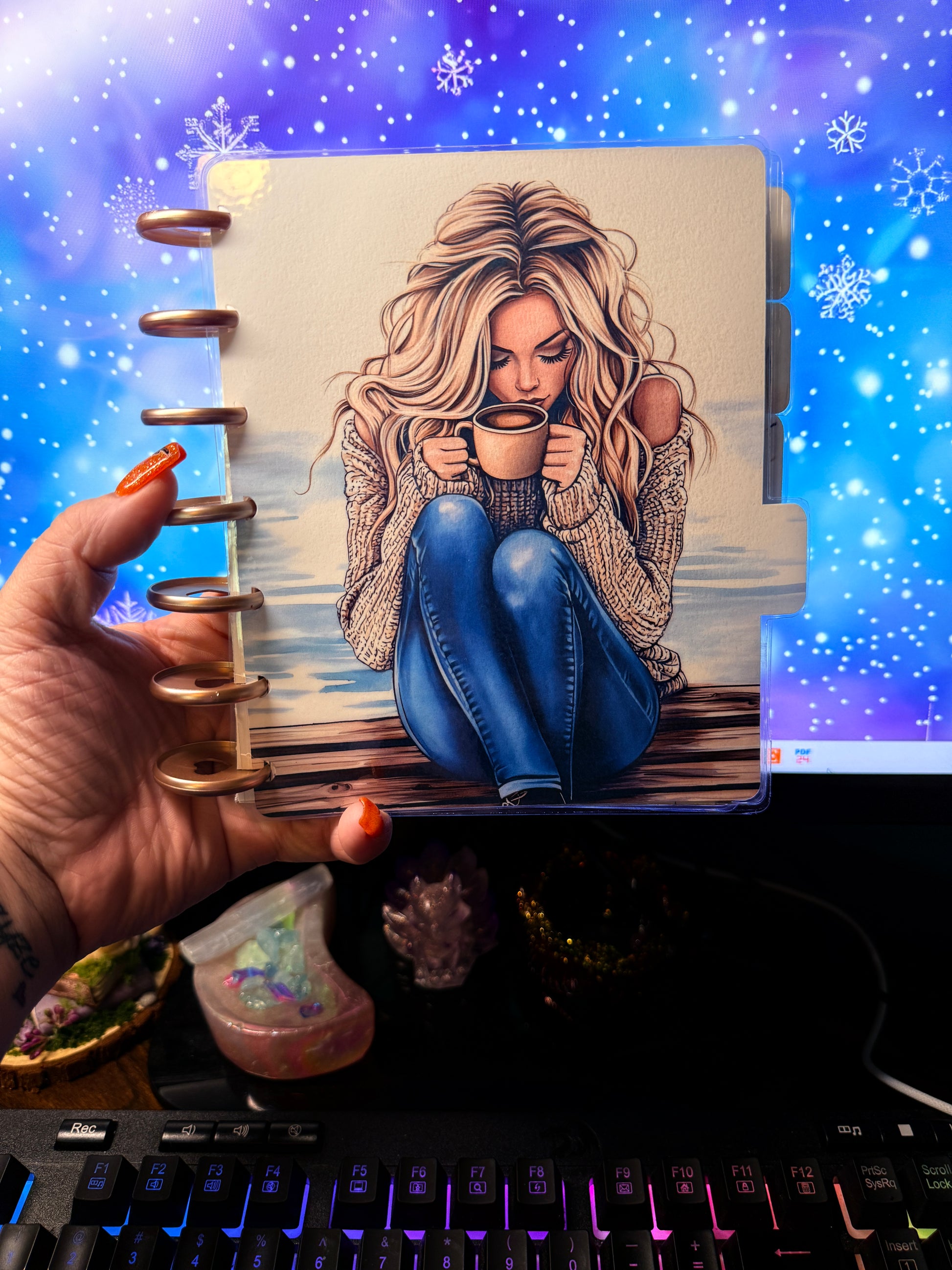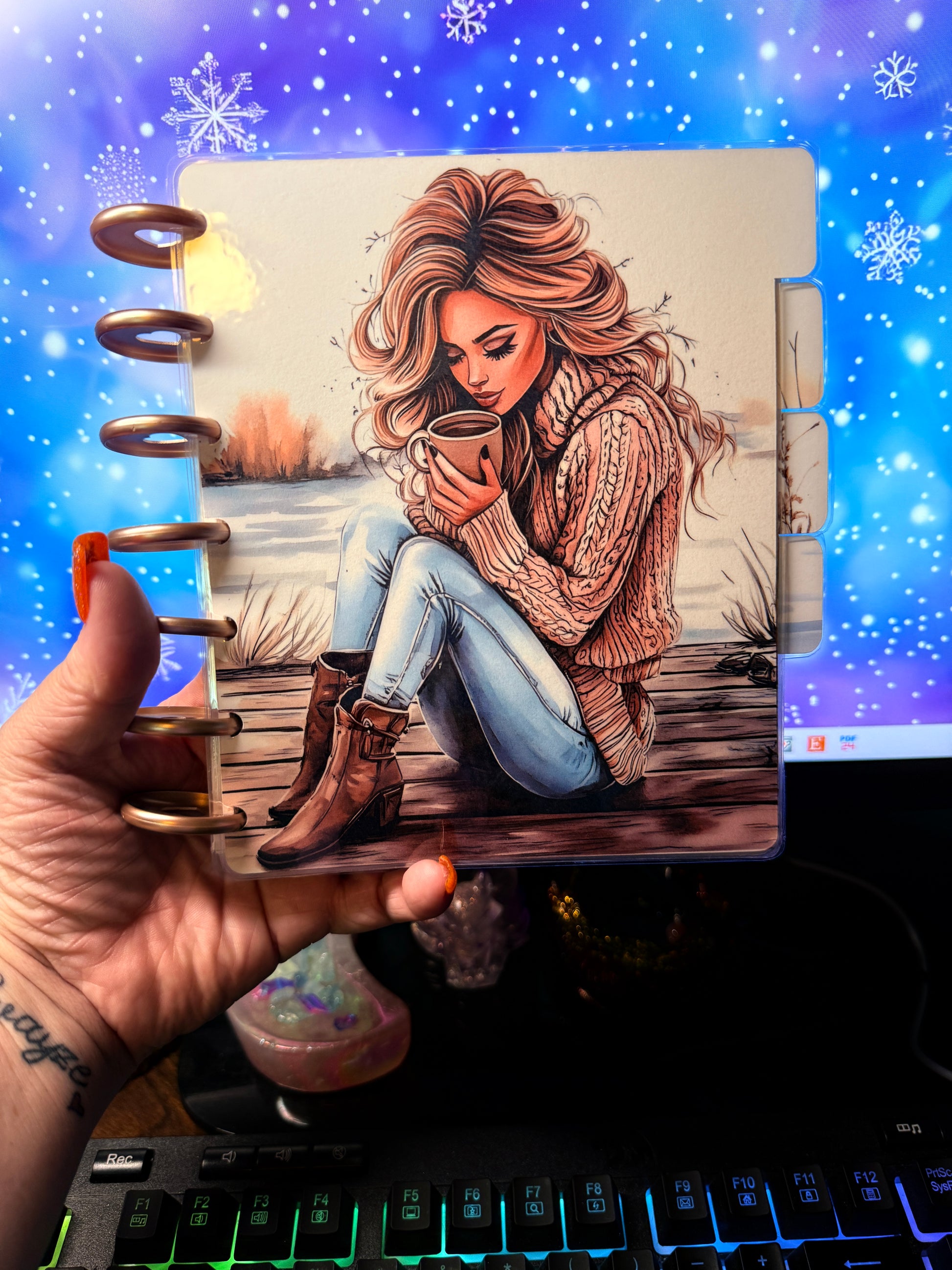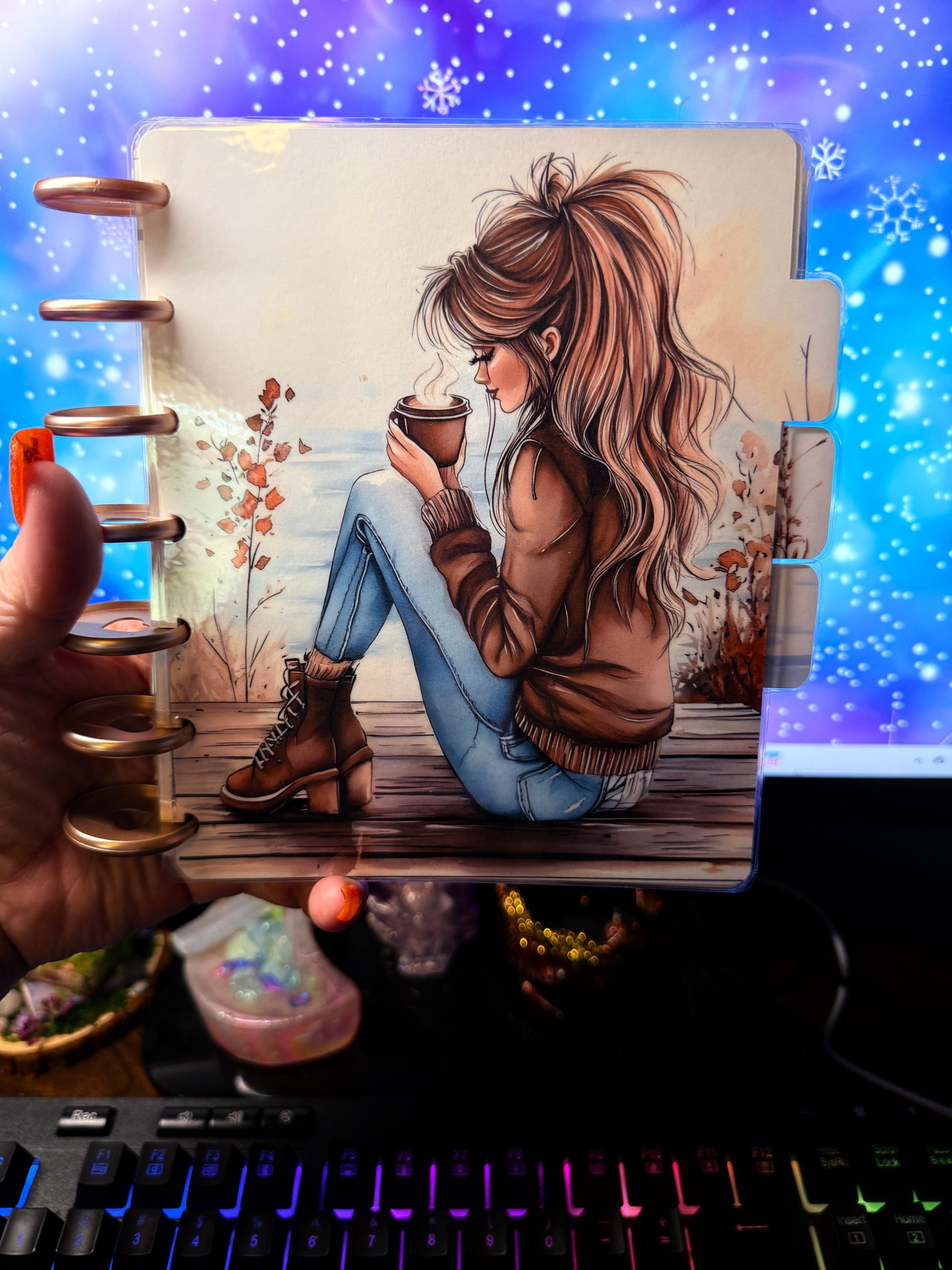 Coffee Girl is a b6 disc covers and dashboards featuring a cozy autumn setting with hot coffee and cool breezes. The system includes four tab dividers and one solid divider, all wrapped in a beautiful front and back cover. Stay organized and motivated with Coffee Girl by your side.