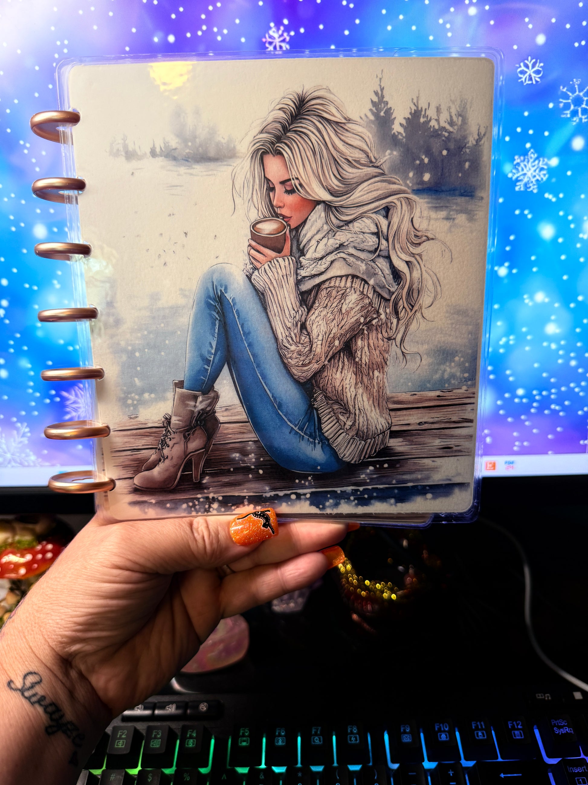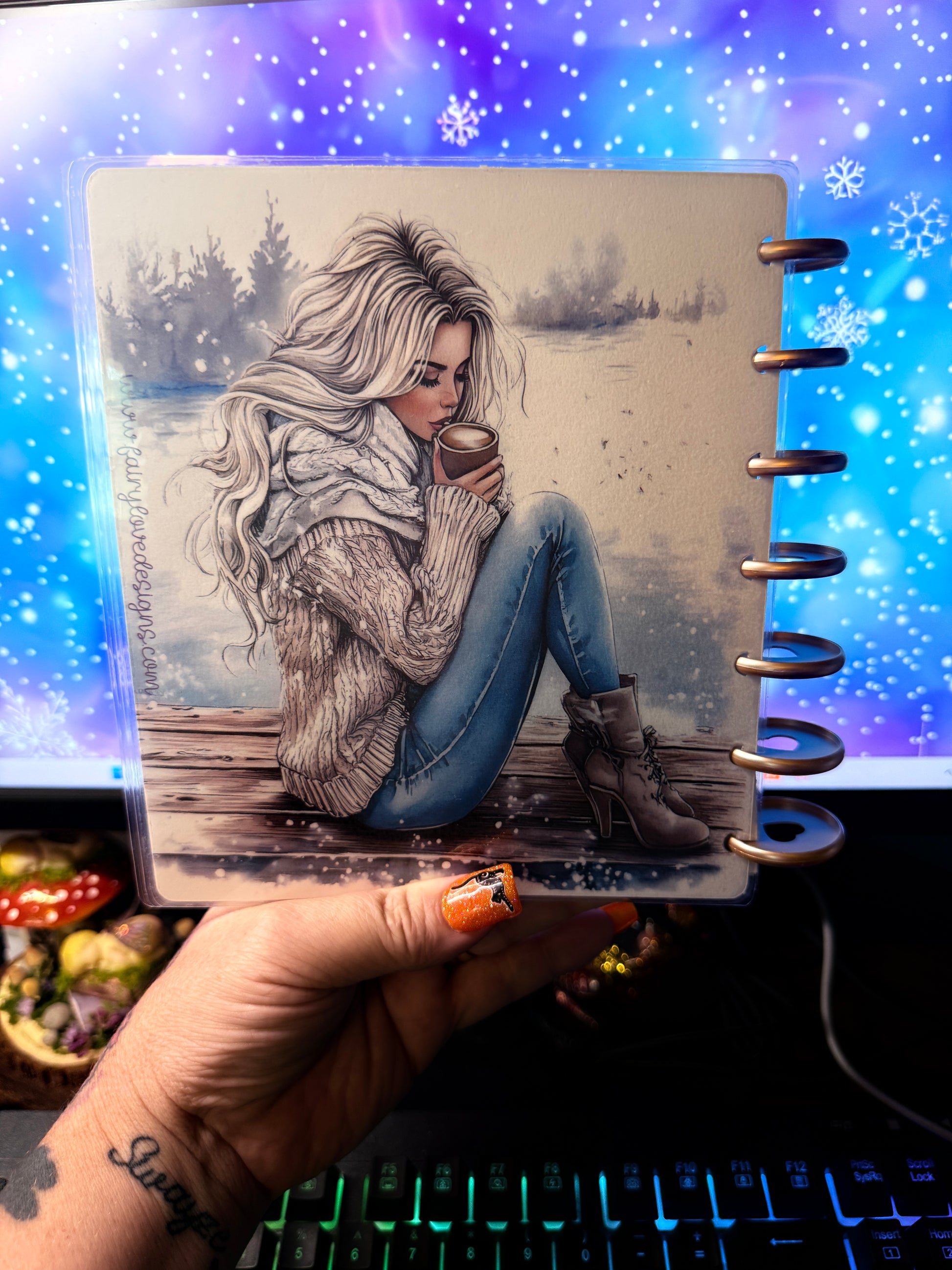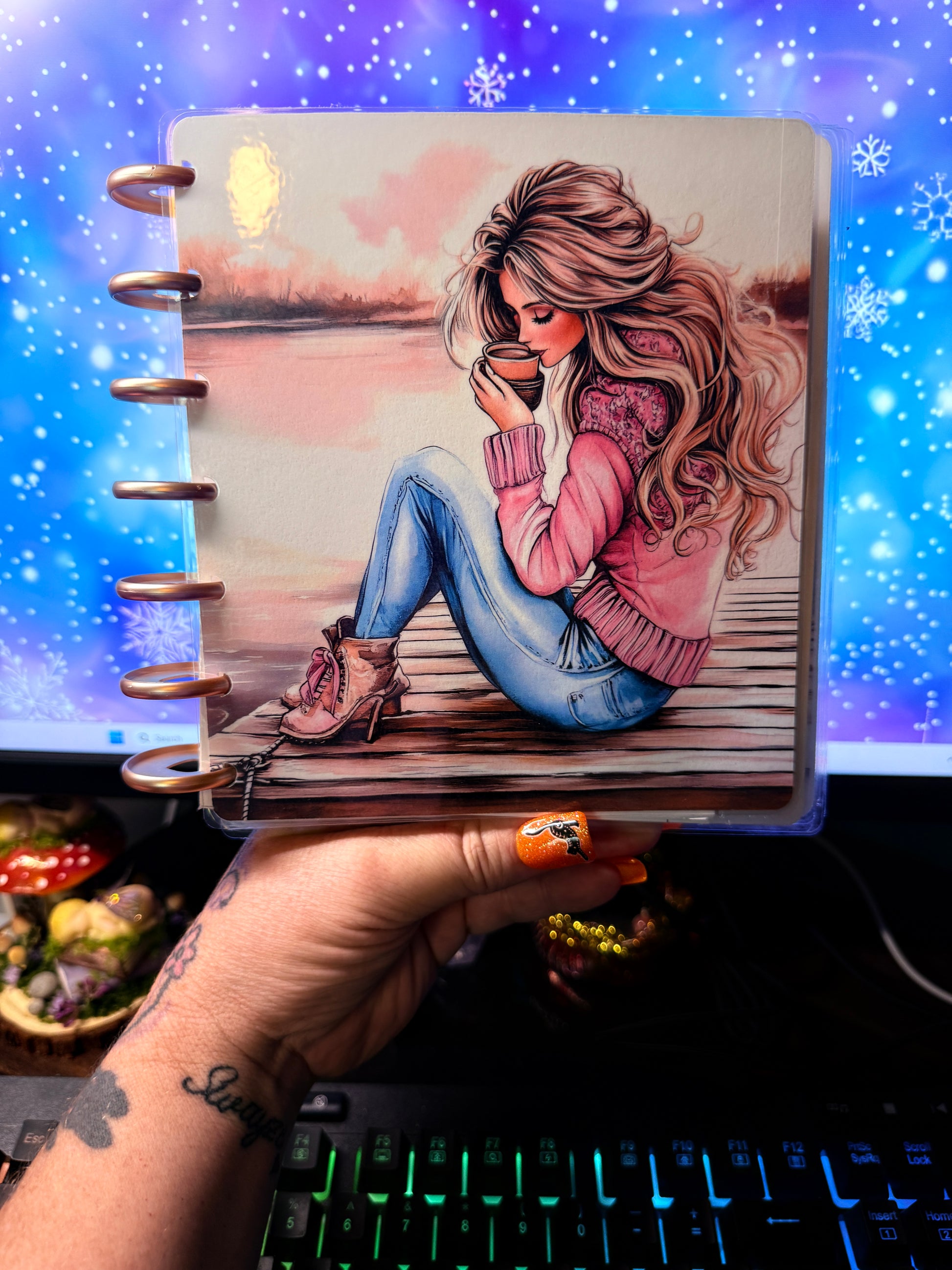 Coffee Girl is a b6 disc covers and dashboards featuring a cozy autumn setting with hot coffee and cool breezes. The system includes four tab dividers and one solid divider, all wrapped in a beautiful front and back cover. Stay organized and motivated with Coffee Girl by your side.