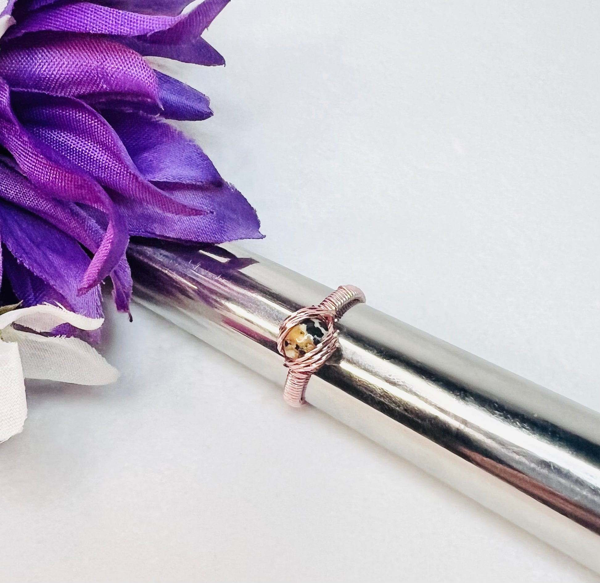 This Dalmatian Stone Ring is a stunning piece crafted with a rose gold setting. Featuring the unique pattern of the dalmatian stone, this ring is sure to sparkle and shine in any wardrobe. Made with a size 10 setting, this piece is sure to make a statement.
