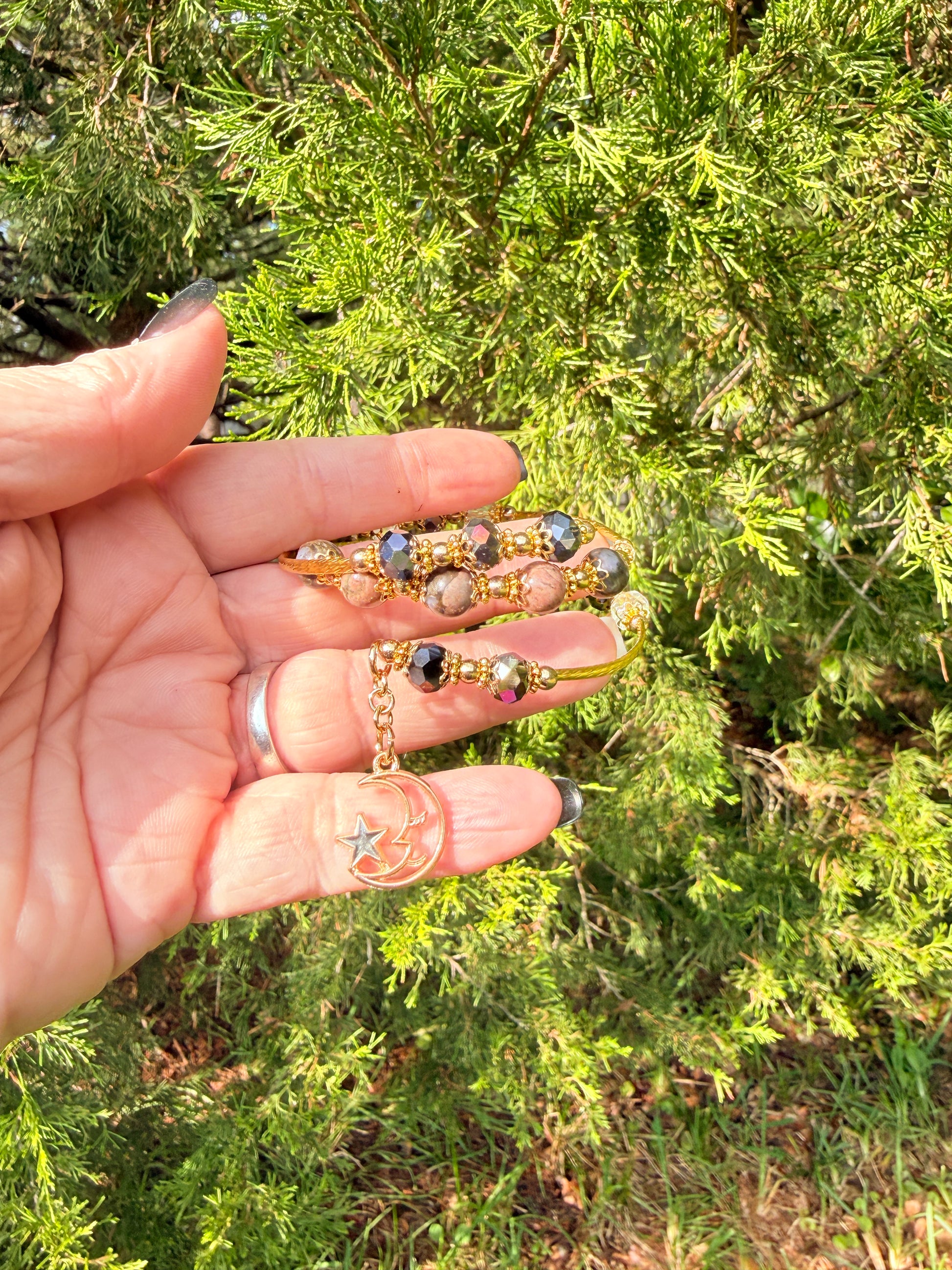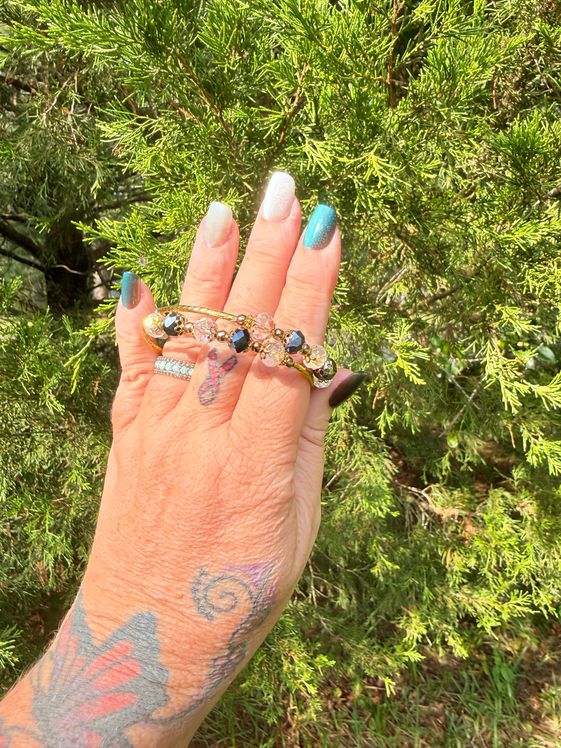 Introducing the Rhodonite Stone Bangle, a unique and stylish piece perfect for any occasion. Made with true stone, glass, and metal beads, this bangle features elegant gold tone accents that are sure to make you stand out. Elevate your look with this statement accessory.